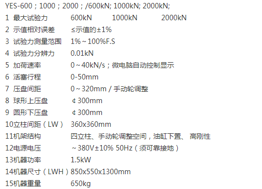 YES系列經濟型數顯式壓力試驗機產品規格YES-600;1000;2000;600kN;1000kN;;2000kN;YES系列經濟型數顯式壓力試驗機產品功能YES系列經濟型數顯式壓力試驗機主要用于混凝土、膠砂、構件、巖石、管樁、建材制品等抗壓測試及研究。YES系列經濟型數顯式壓力試驗機也可用于各種金屬、非金屬及復合材料。精密